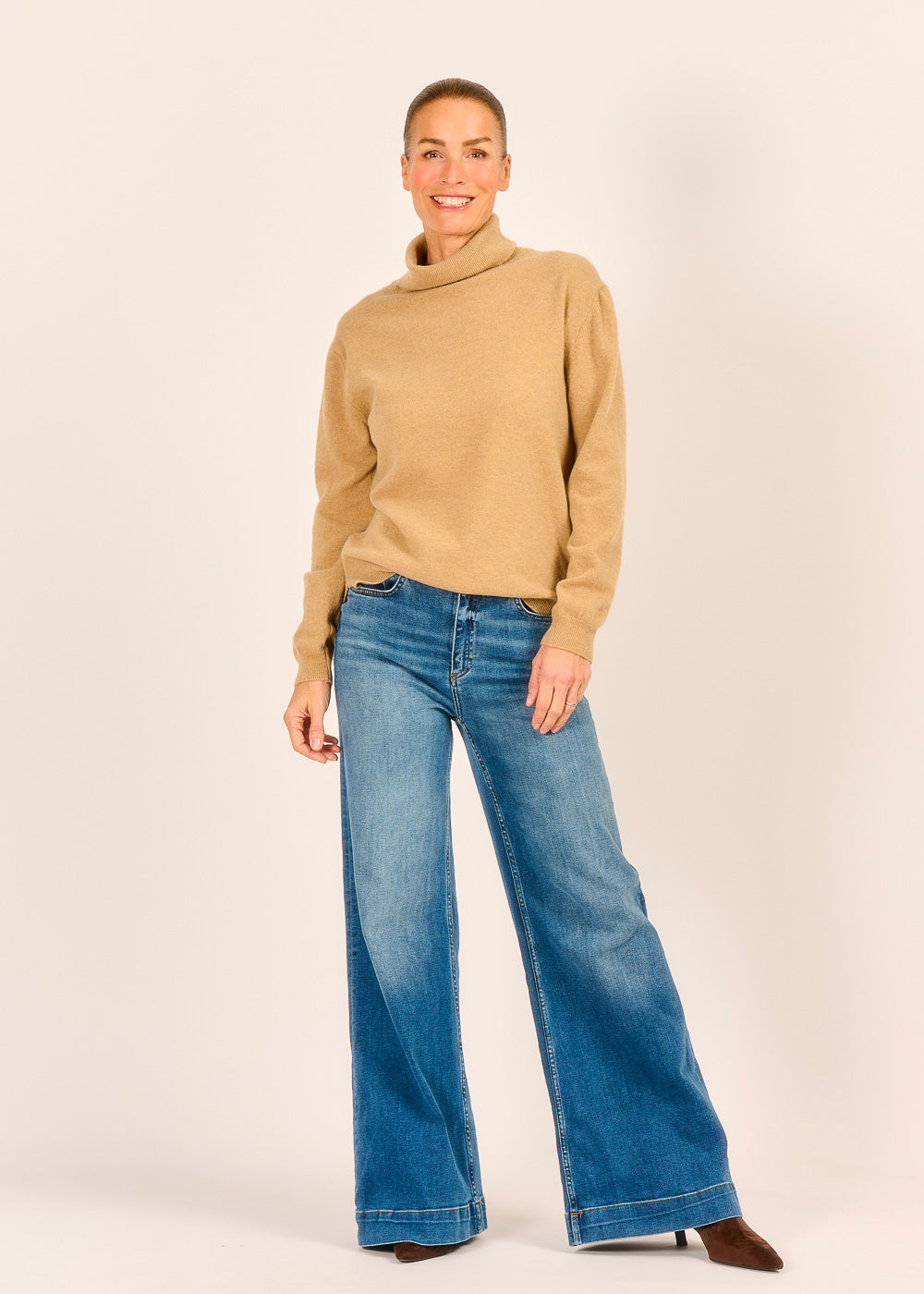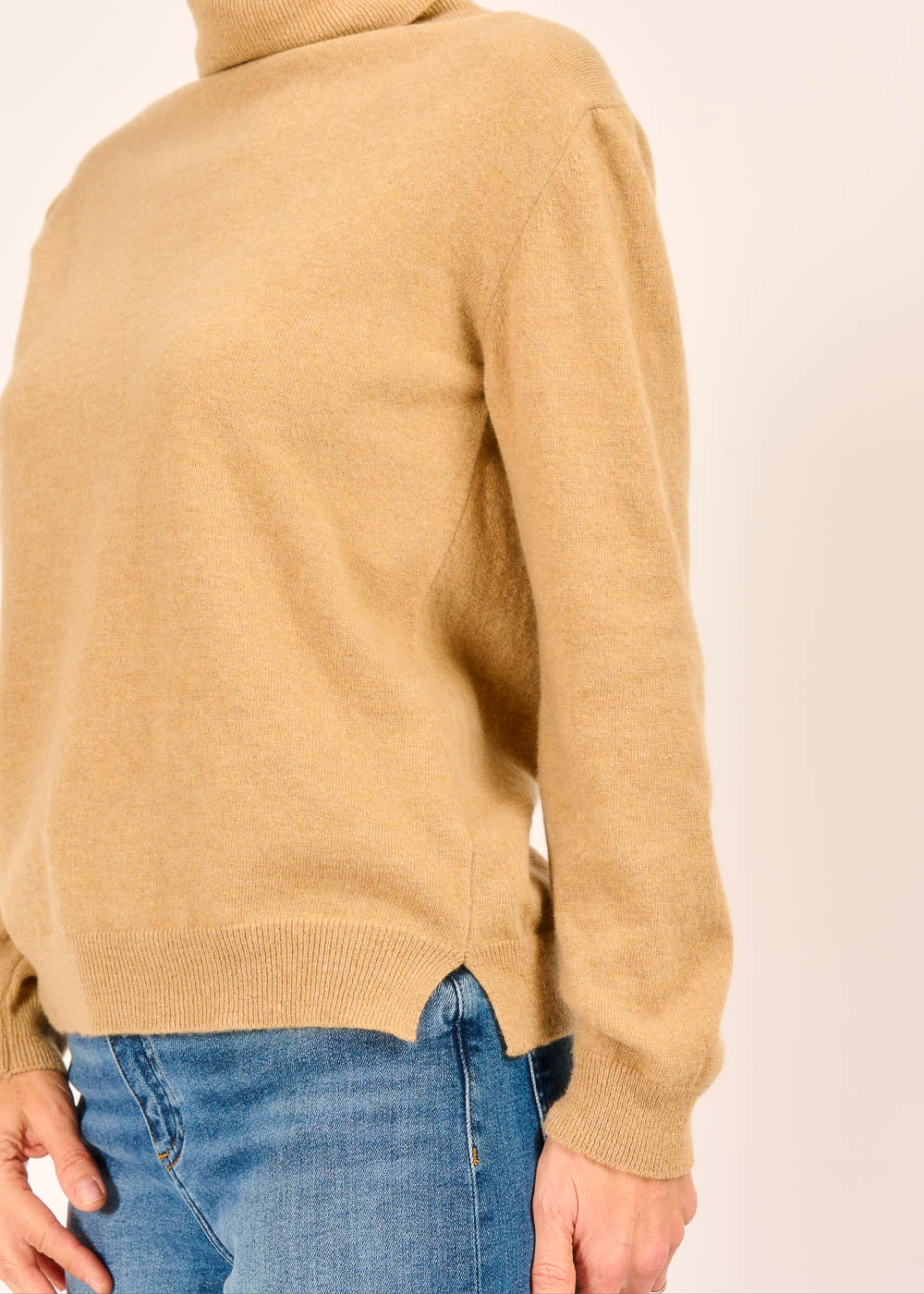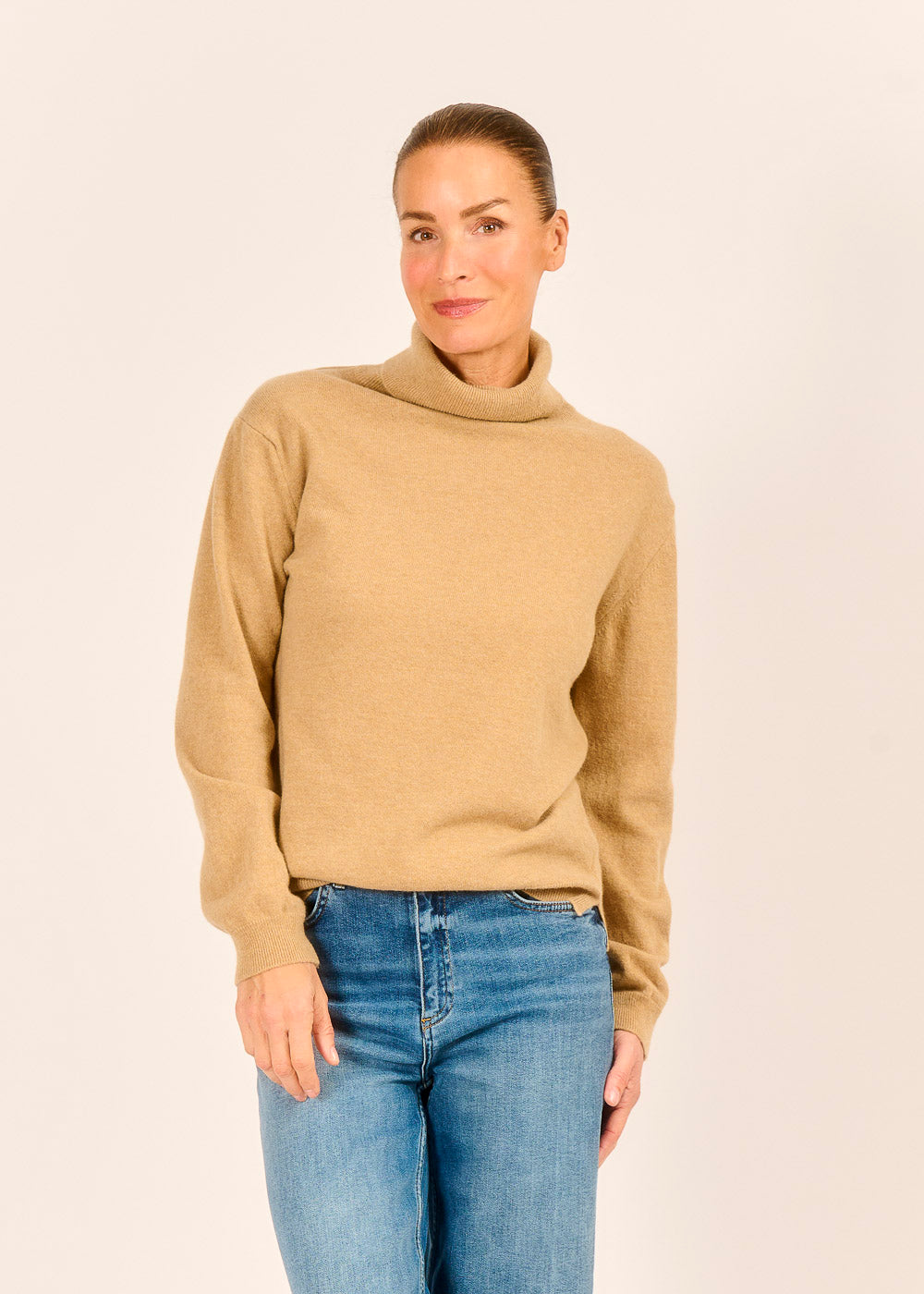 Dieser edle Rollkragenpullover in zeitlosem Beige ist ein Statement purer Eleganz, dessen feine Strickqualität sofort ein Gefühl von Luxus vermittelt. Sein klassischer Schnitt mit dem weichen Rollkragen sorgt nicht nur für wohlige Wärme, sondern rahmt auch Ihr Gesicht vorteilhaft und stilvoll ein. Kombiniert mit lässigen Jeans oder einem eleganten Rock, wird dieser Pullover schnell zum Key-Piece Ihrer Garderobe für jede Gelegenheit.