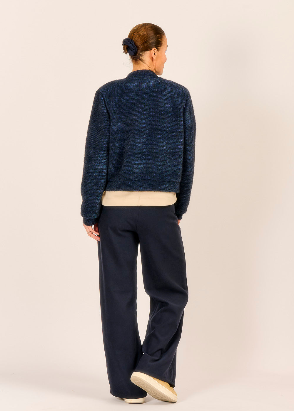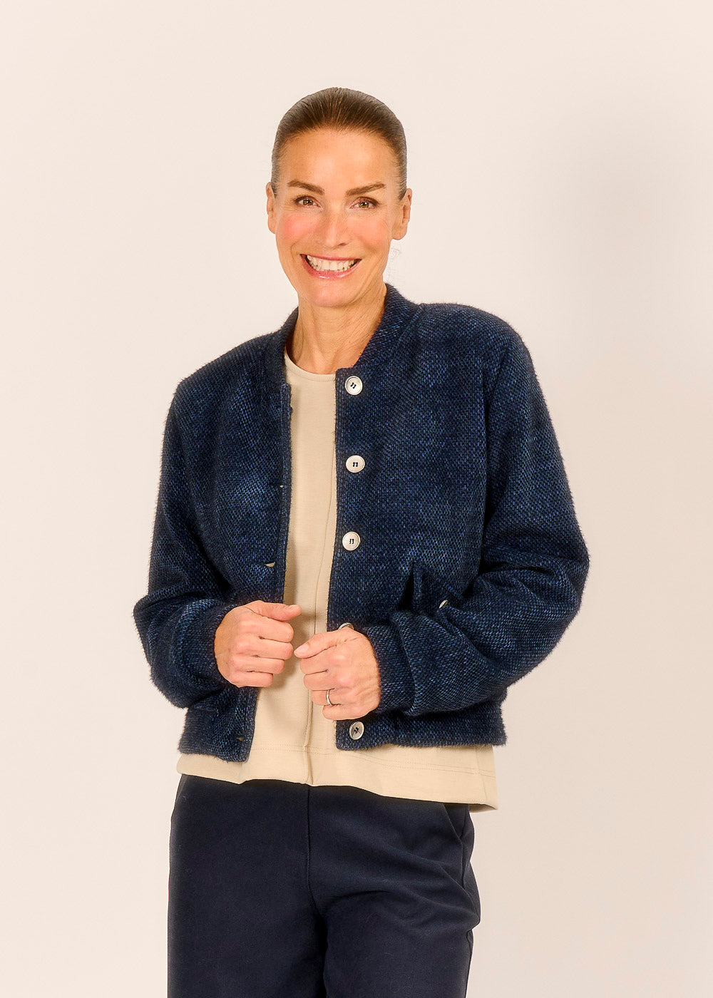 Dieses kurze Bomberino in tiefem Blu Scuro (Dunkelblau) ist ein sehr stylisches und modernes Statement-Piece, das eine lässige Silhouette mit eleganter Textur vereint. Besonders edel wirken die kontrastierenden, großen, perlmuttartigen Knöpfe, welche der Jacke einen einzigartigen, hochwertigen Akzent verleihen. Tragen Sie diese charmante Strickjacke als schicken Ersatz für einen Blazer, um Ihrem Outfit sofort einen frischen und modischen Twist zu geben.