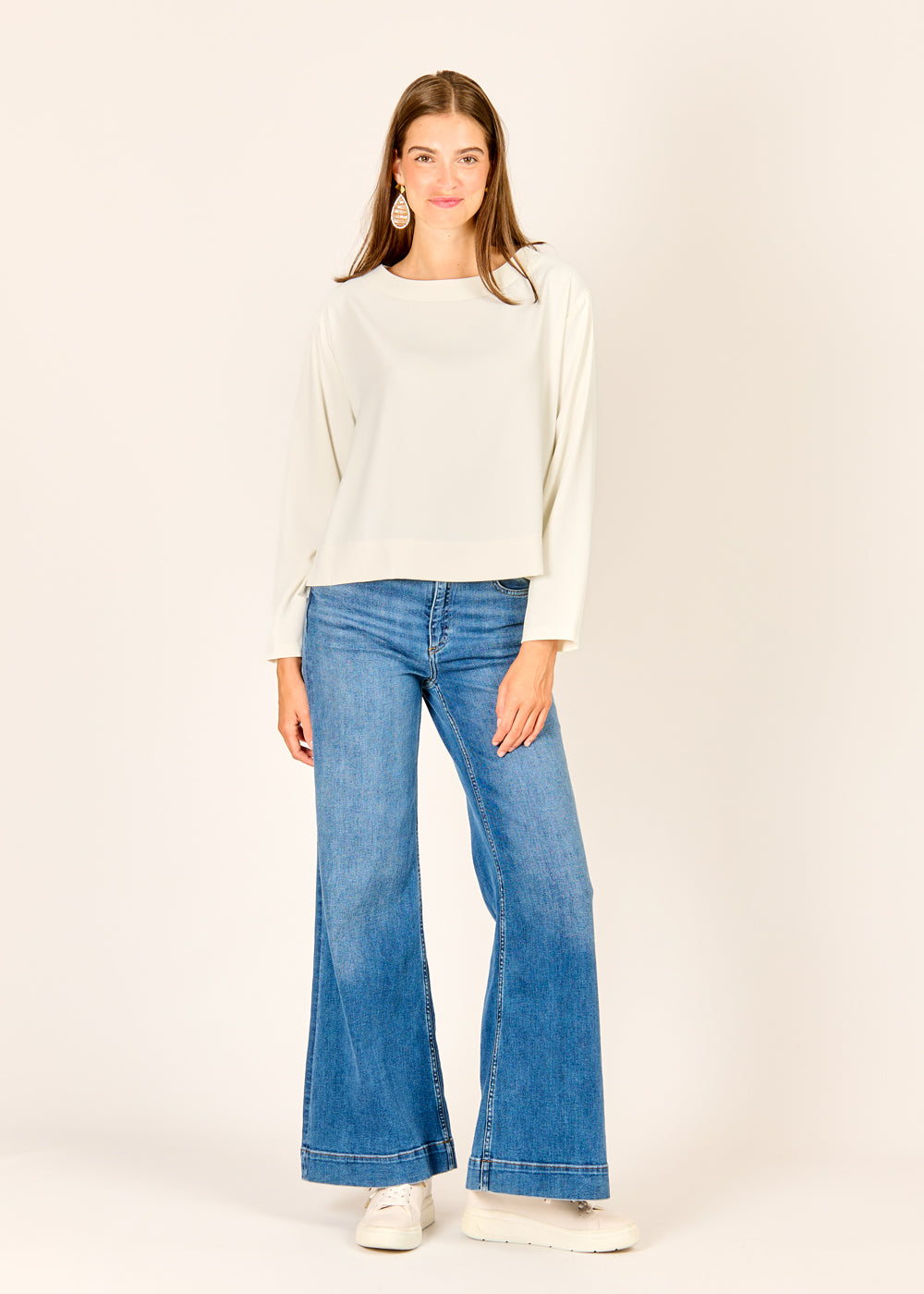 Dieses luxuriöse Langarmshirt in Crème-Weiß besticht durch seine schlichte Eleganz und den edlen U-Boot-Ausschnitt. Gefertigt aus einem fließenden Material, umspielt es sanft die Figur und bietet ein unvergleichlich angenehmes Tragegefühl. Ein vielseitiges Basic, das sowohl solo als auch unter einem Blazer getragen werden kann und jedem Outfit eine raffinierte Note verleiht.
