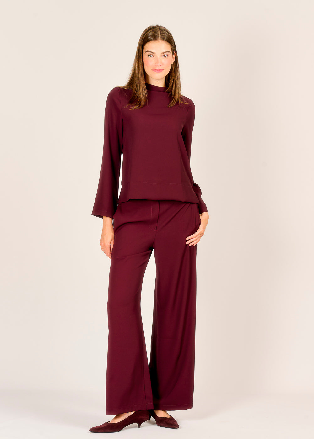 Eleganz trifft auf Raffinesse – dieses edle Blusenshirt in tiefem Vino ist ein stilvoller Begleiter für viele Anlässe. Hinten mit zwei dezenten Knöpfen veredelt und seitlichen Schlitzen versehen, bringt es Leichtigkeit und feine Details in dein Outfit. Ein feminines Must-have, das mühelos Chic und Komfort vereint.
