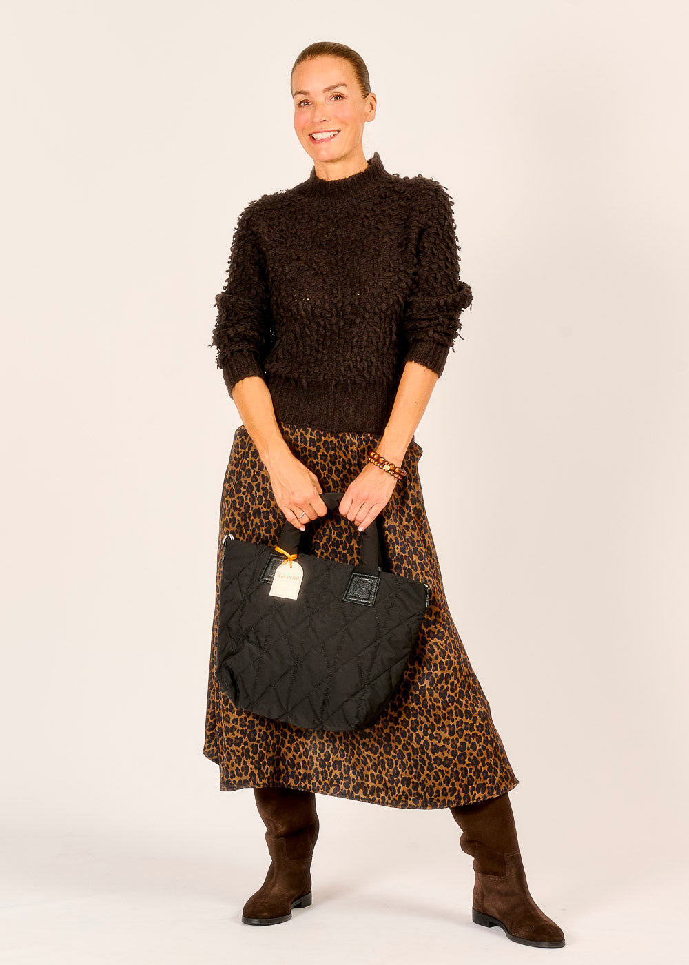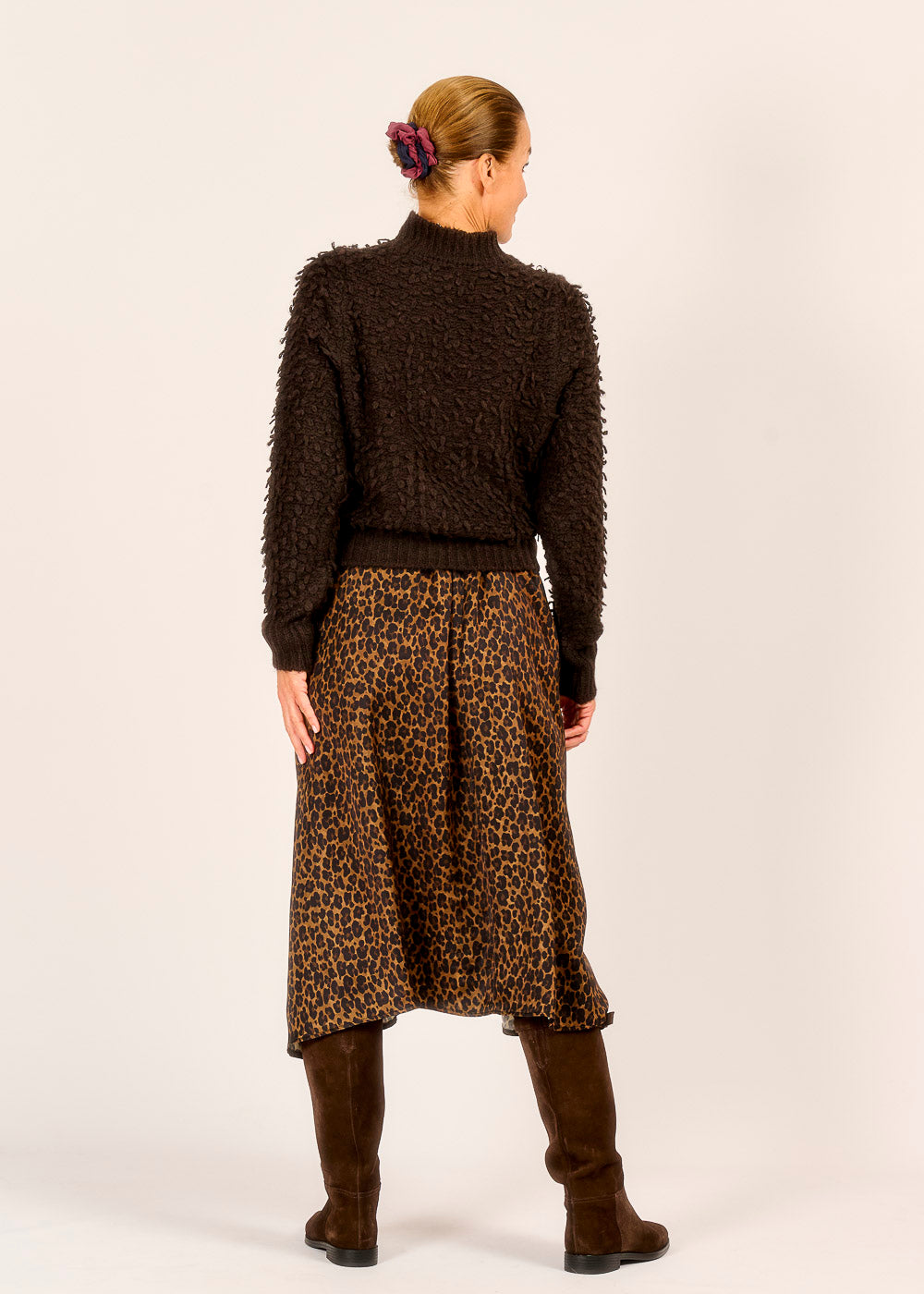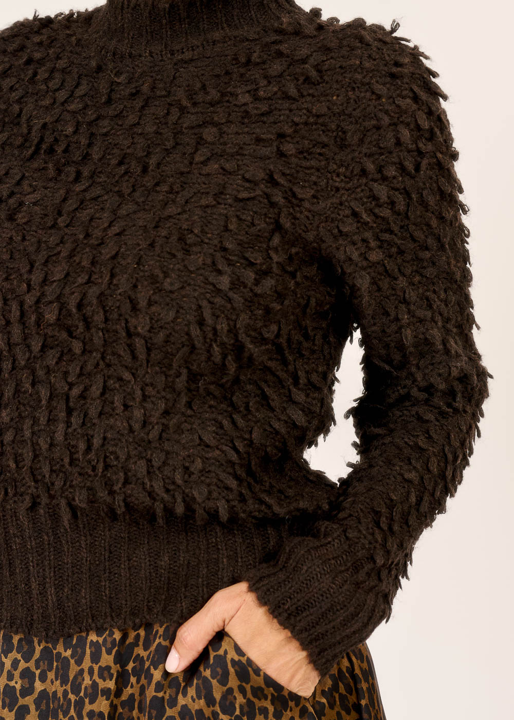 Tauche ein in die Welt der Texturen mit unserem besonderen Pullover in warmem Moka. Seine einzigartige, flauschige Struktur macht ihn zu einem echten Statement-Piece. Der hohe Kragen und die weiche Strickqualität sorgen für wohlige Wärme und einen luxuriösen Tragekomfort. Perfekt kombiniert mit einem Rock mit Tiermuster, kreierst du im Handumdrehen einen ausdrucksstarken Look.