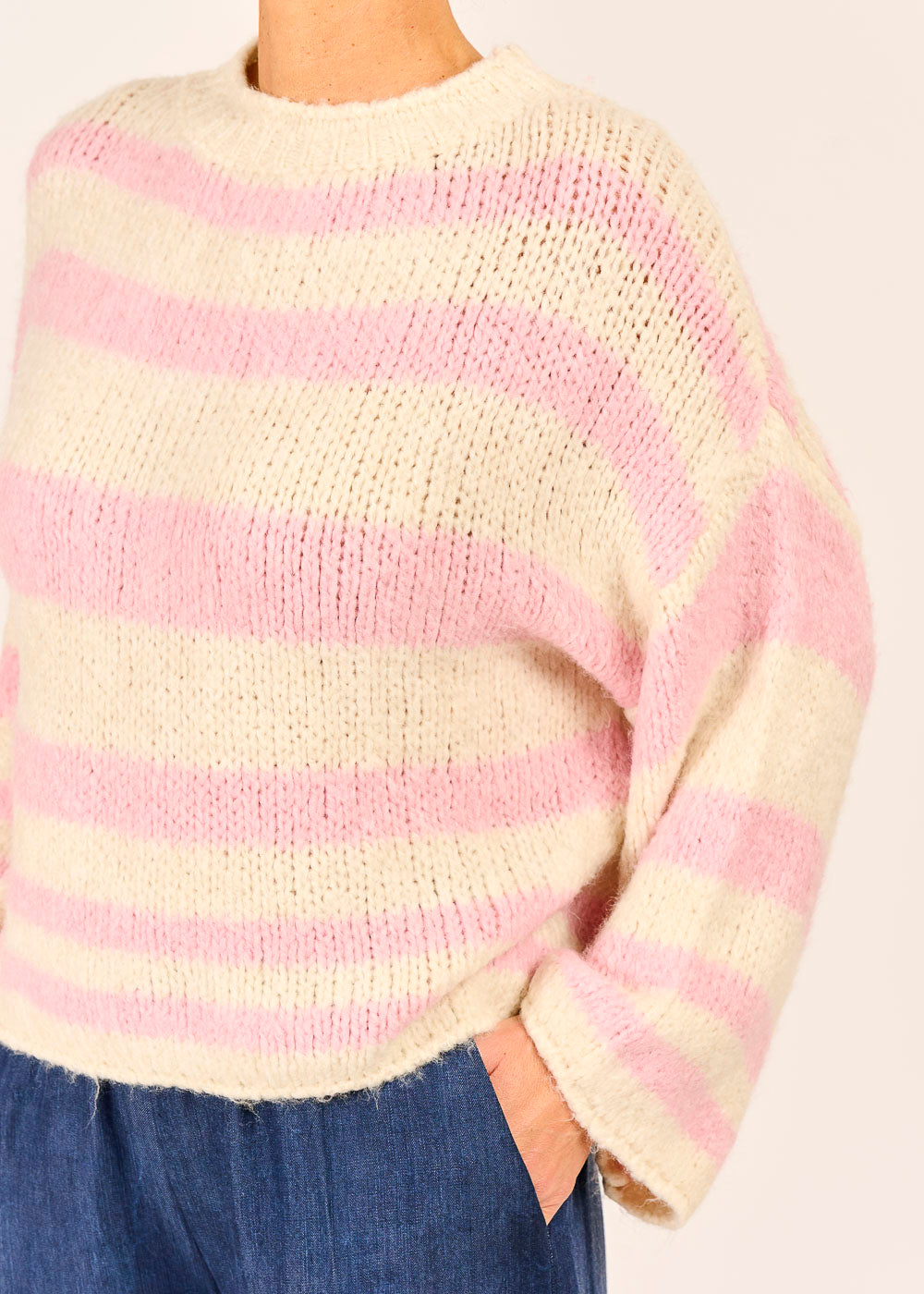 Dieser kuschelige Streifenpullover ist ein charmantes Statement-Piece, das mit einer harmonischen Farbkombination aus hellem Beige (oder Creme) und zartem Rosa besticht. Der grobe Strick und der lockere Schnitt sorgen für ein wunderbar weiches und komfortables Tragegefühl. Ein perfektes Basic, das lässige Denim-Looks sofort mit einem Hauch von Frische und Verspieltheit belebt.