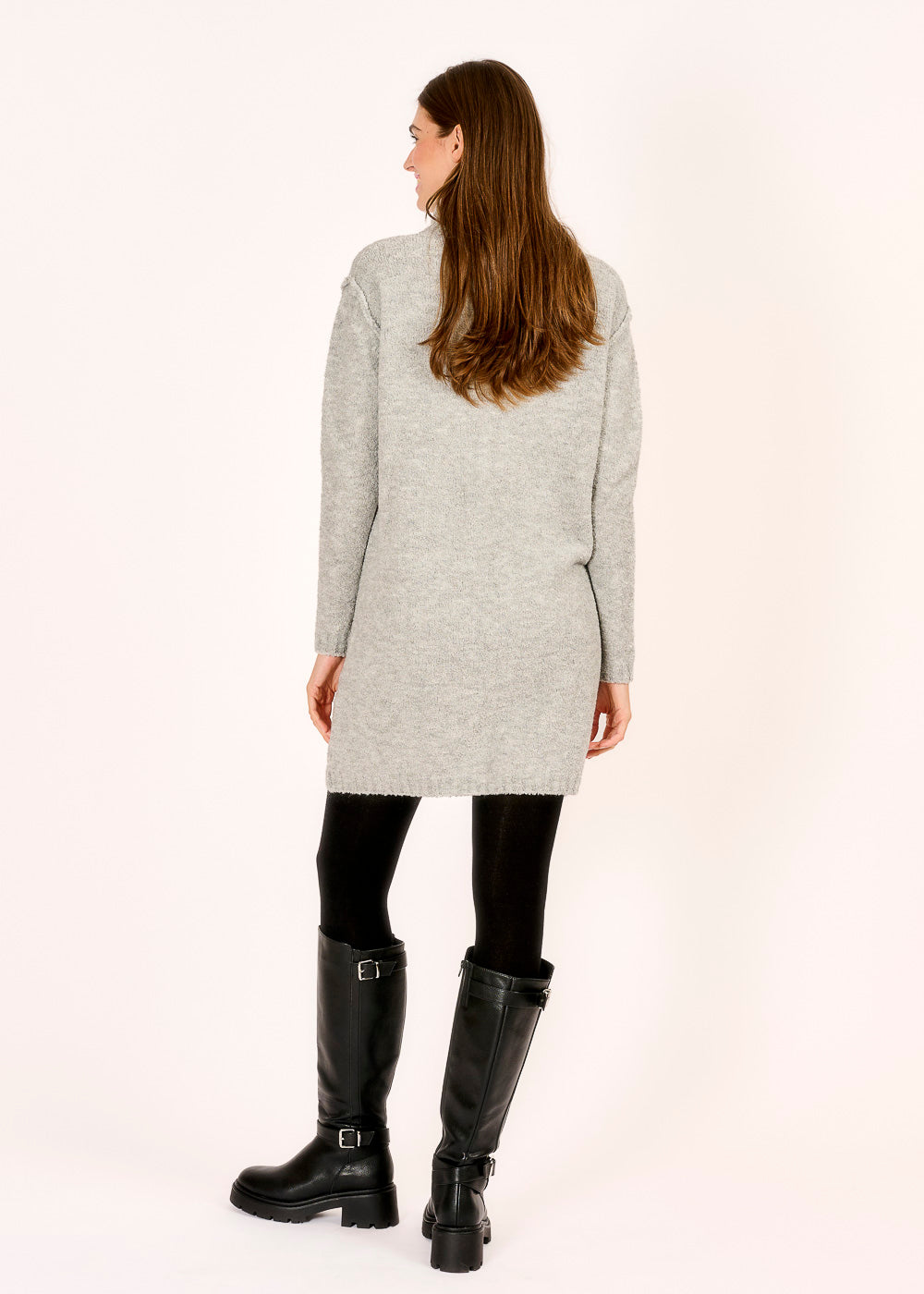 Kuschelig, stilvoll und vielseitig – dieses graue Strickkleid wird dein neuer Lieblingsbegleiter für kühle Tage. Ob lässig mit Boots oder elegant mit Absatzstiefeln, du bist immer perfekt gestylt.