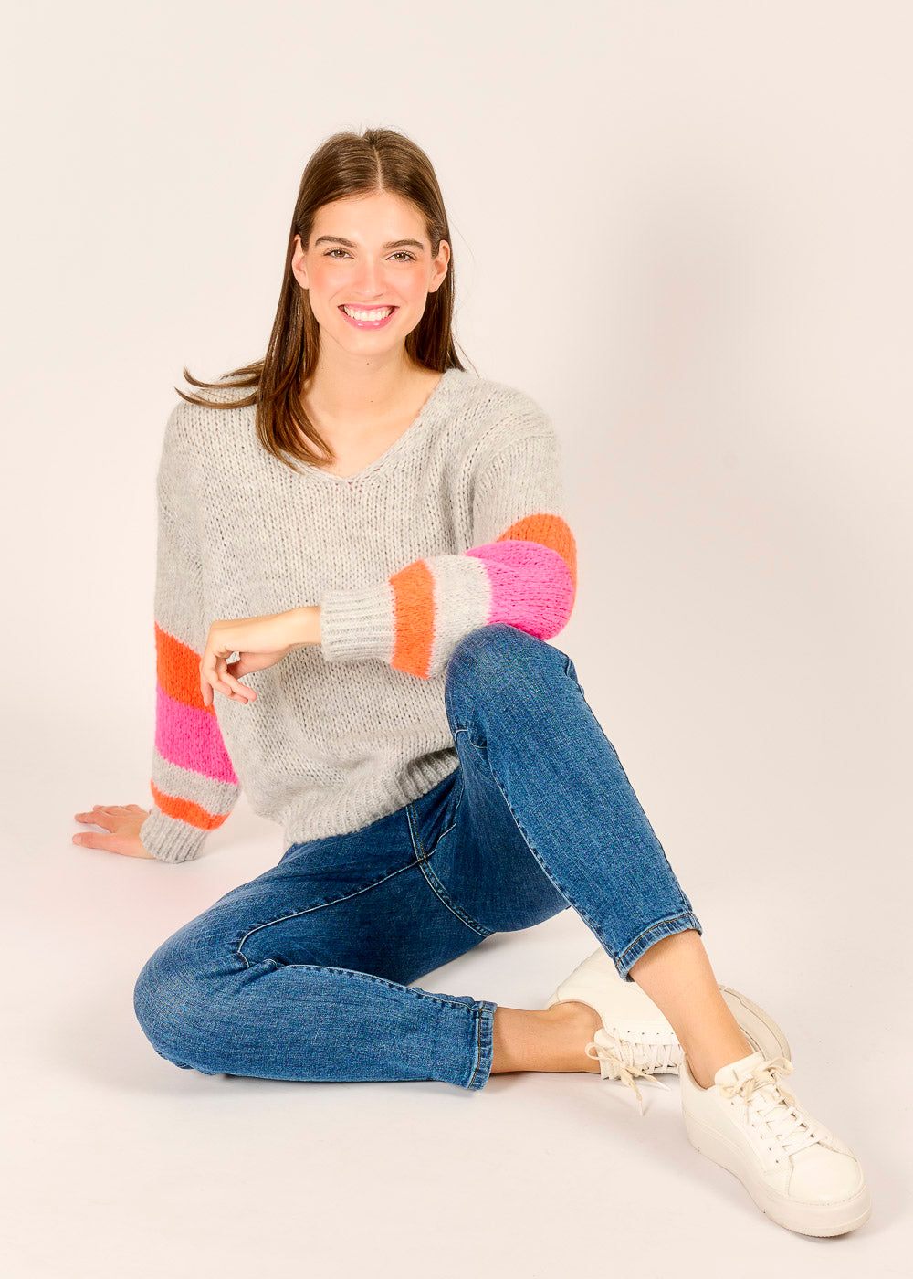 Füge deiner Garderobe einen Farbtupfer hinzu mit unserem Pullover in meliertem Grau. Das weiche Material sorgt für ein kuscheliges Tragegefühl und macht ihn zum perfekten Begleiter für kühle Tage. Ein echter Hingucker sind die bunten Ringel in Pink, Orange und Weiß an den Ärmeln. Mit seinem lässigen V-Ausschnitt passt er perfekt zu Jeans und verleiht deinem Outfit einen coolen und entspannten Look.