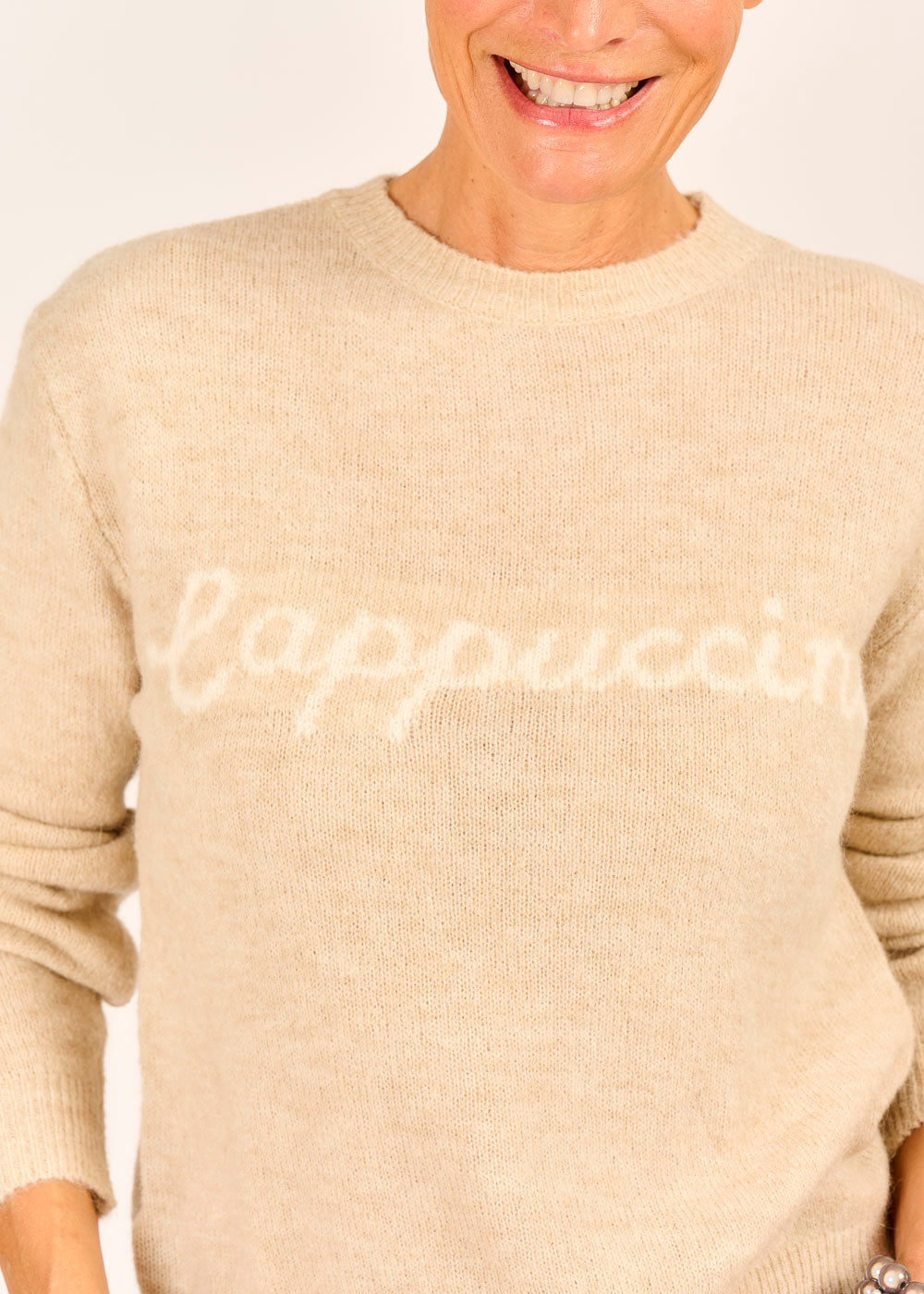 Gönn dir diesen kuscheligen Cappuccino-Pullover in einem warmen Beige-Ton. Das verspielte, gestickte "cappuccino"-Detail auf der Brust sorgt für ein charmantes Statement. Aus einem superweichen Material gefertigt, bietet er dir den idealen Mix aus Lässigkeit und Gemütlichkeit für jeden Tag.